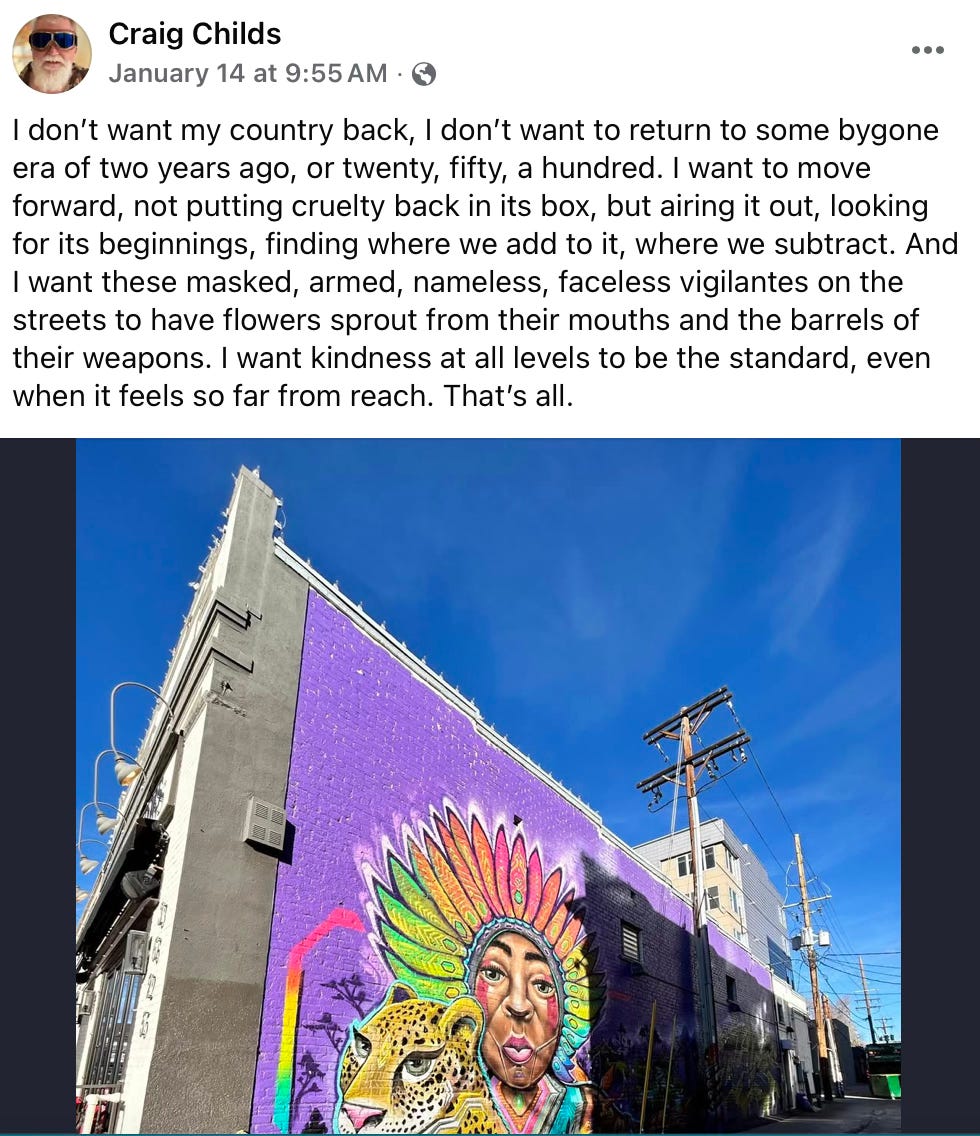 “I don’t want my country back, I don’t want to return to some bygone era of two years ago, or twenty, fifty, a hundred. I want to move forward, not putting cruelty back in its box, but airing it out, looking for its beginnings, finding where we add to it, where we subtract. And I want these masked, armed, nameless, faceless vigilantes on the streets to have flowers sprout from their mouths and the barrels of their weapons. I want kindness at all levels to be the standard, even when it feels so far from reach. That’s all.”––Craig Childs