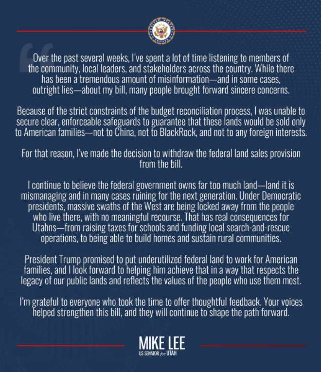 As for the sale of public land, Lee’s statement about the removal alludes to his unyielding belief that the federal government owns too much land: