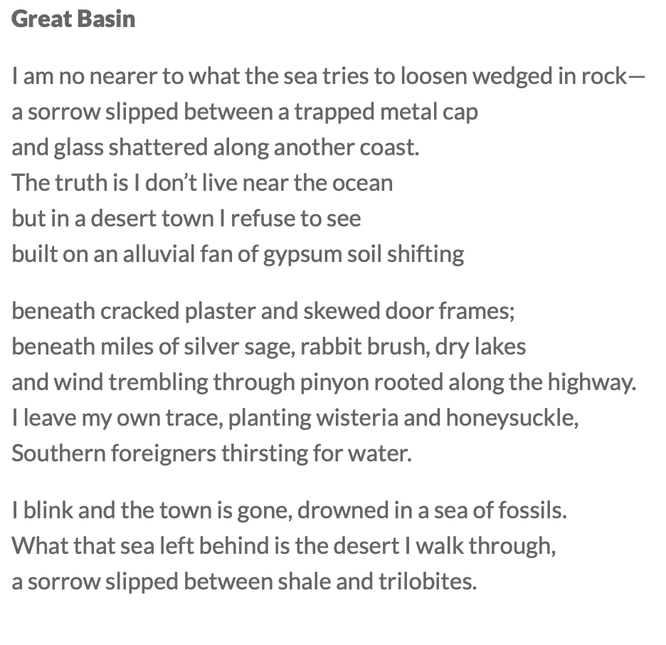 The Great Basin knows how to take a long view. The region, stretching from the Wasatch Front to the Sierra Nevada was once flooded by a shallow inland sea. Within the past 560 million years, those waters have drained, while tectonic forces shifted, lifted, and stretched the sea’s ancient sediments and metamorphosed volcanic rock. Later, glaciers sculpted peaks and lakes. The basin and range province continues to stretch itself today. I suppose we humans can follow its lead and do the same, for the land and each other, in the geological blip we are here.