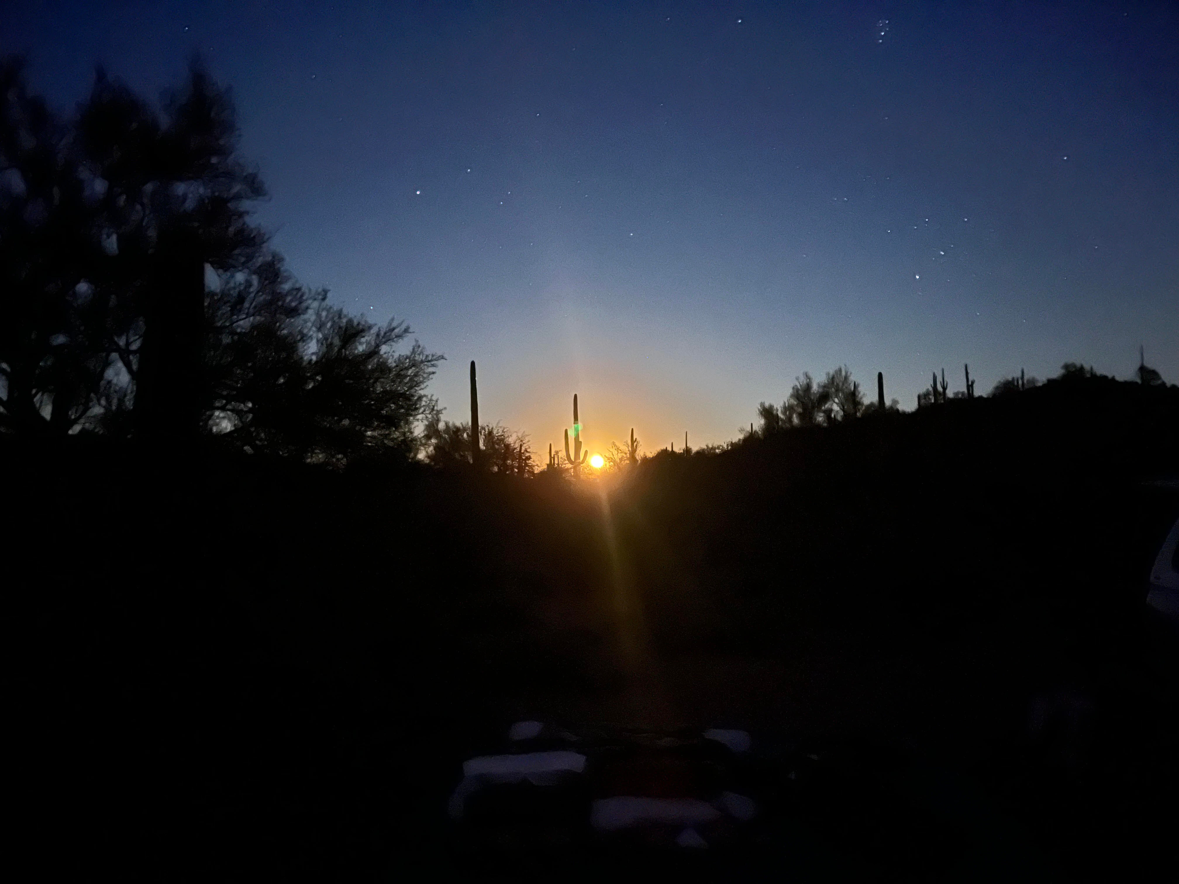 It is a beloved tradition to spend the shortest days of the year soaking up every moment of sunshine and savoring the longest nights in semi-hibernation. This week, a coati kept us company for a few nights. We honored the critter’s active hours, despite the overlap with our rest period. We unabashedly will go to bed as early as we feel like, once it’s dark, so it is hard to whine about an intrusion while being prone for 12+ hours. The nighttime wildlife encounters remind us that this is not “lost time” but a daily period of powerful connection, where the lives that inhabit the desert graciously share space with us.