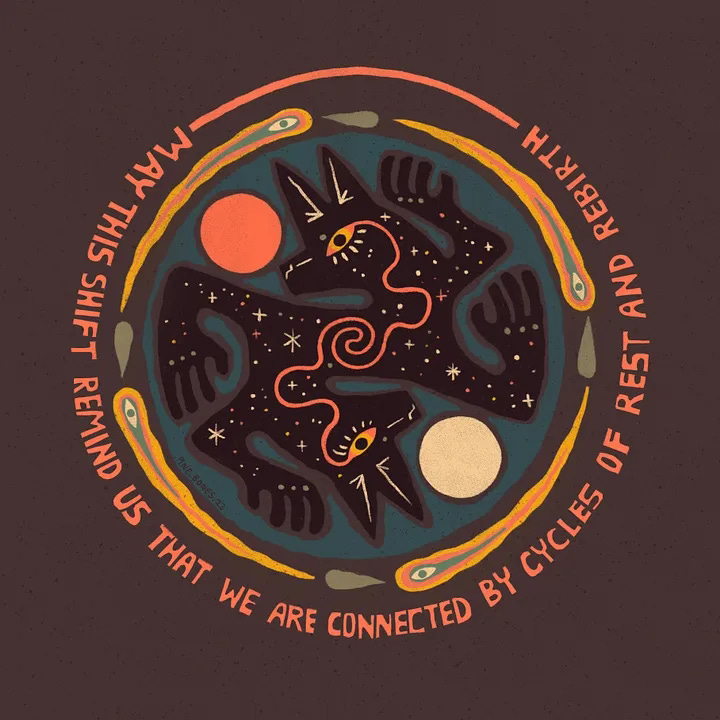 Artist Hols Wack created a beautiful series of images (below) for a Substack essay titled, “The Resting Season,” that calls attention to the ways a time-honored tradition emphasizing rest during this season has shifted into a pressure-riddled period to be as productive as possible, especially for independent creators whose livelihoods largely depend on holiday sales.