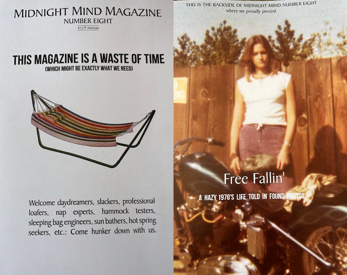 Midnight Mind Magazine is a delightfully irreverent cultural review print publication that Van Emst resurrected from a 20-year hiatus. Past contributors included Jim Harrison, and two essays from the last issue are nominated for a Pushcart Prize. The current issue is in color, and I particularly enjoy random photographs from the seventies and postcard ephemera. Nostalgia scrolling.